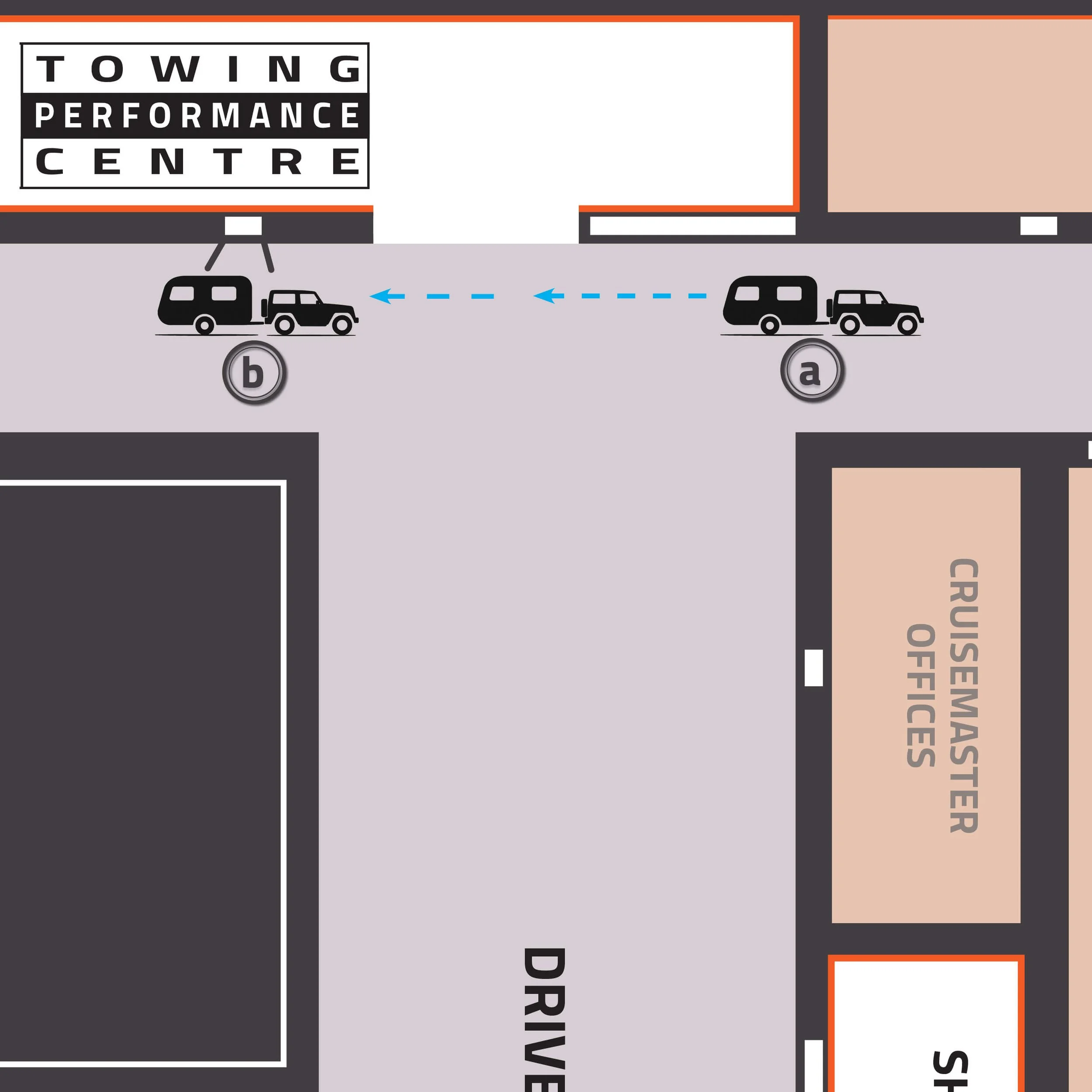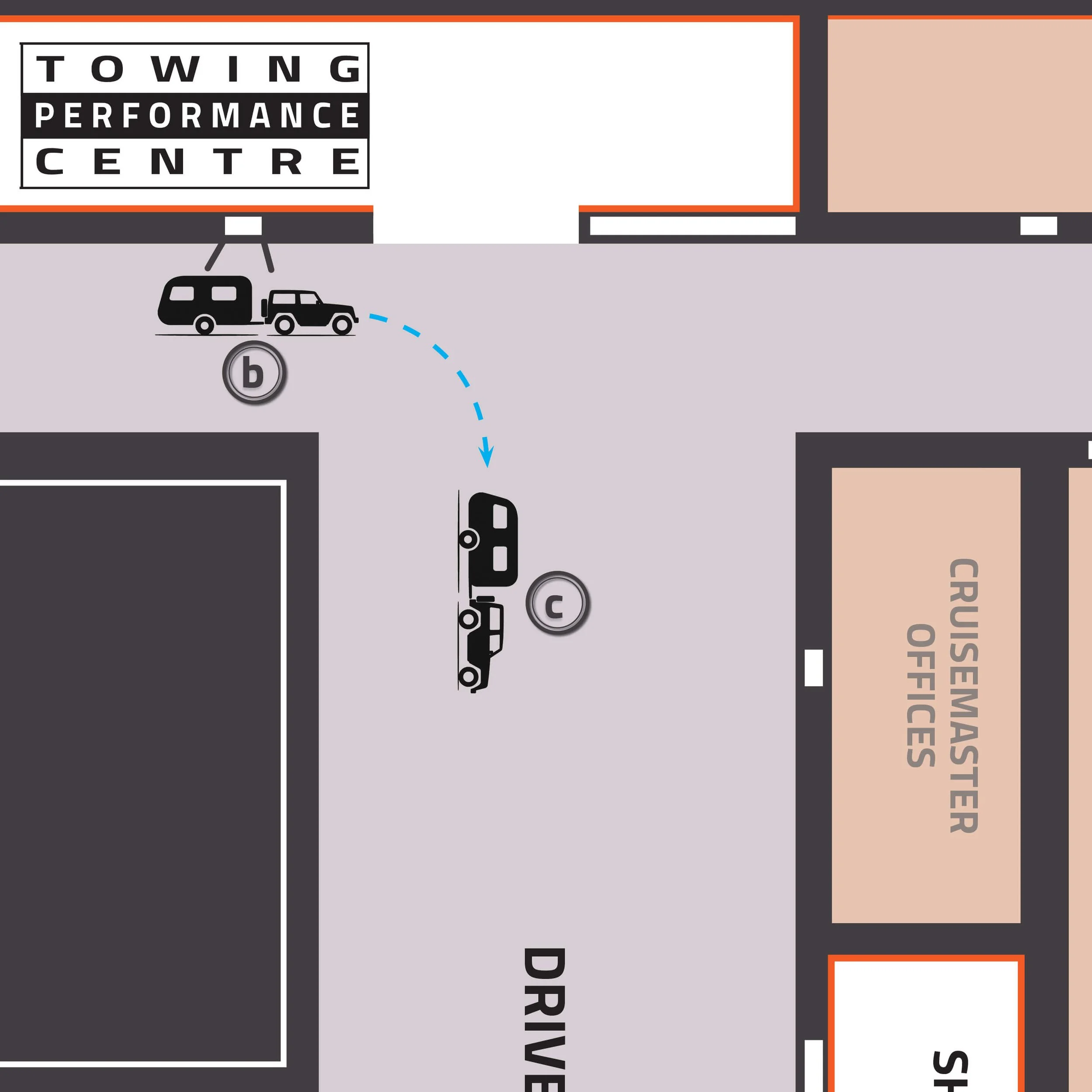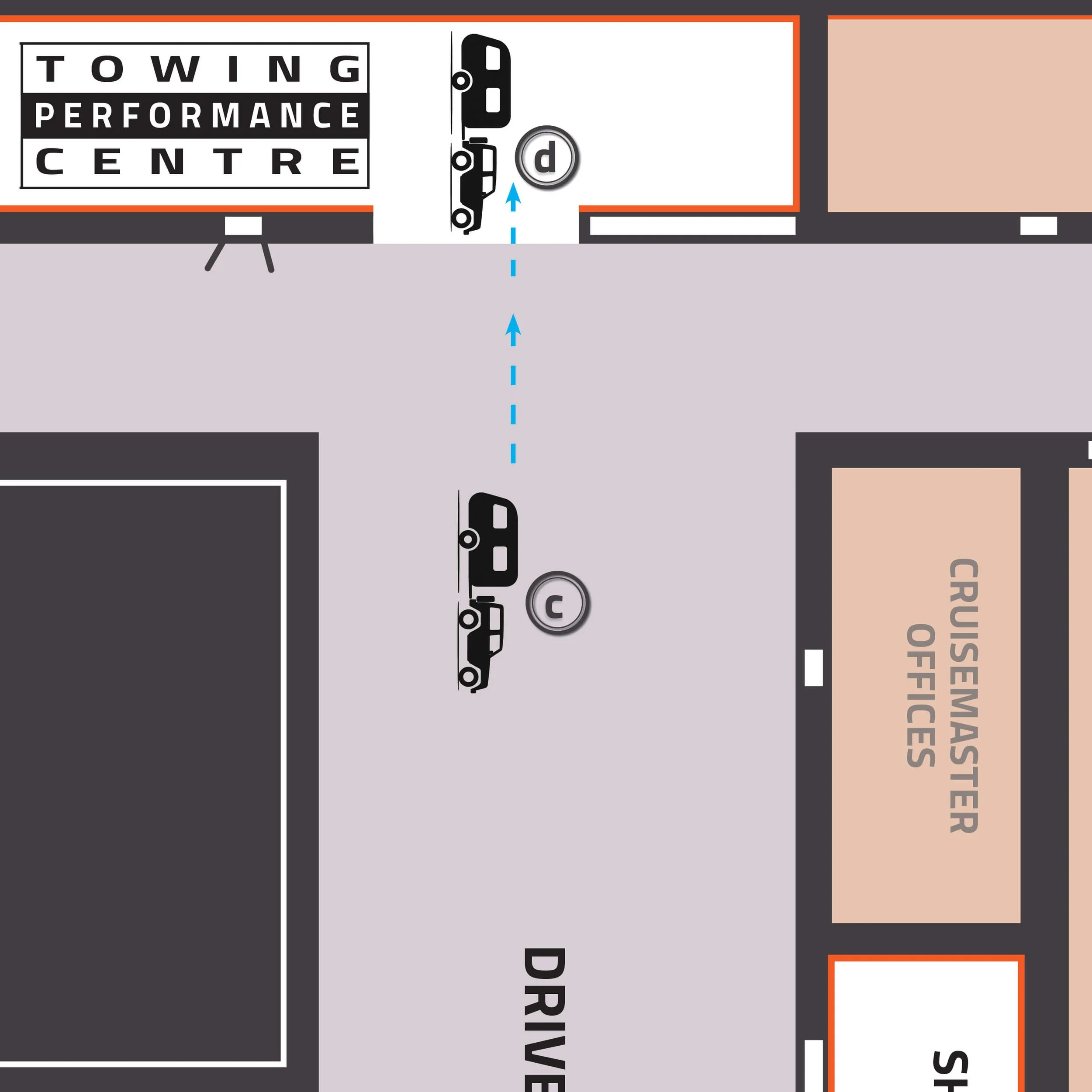 Turn right down the main driveway until the caravan is aligned with the roller door directly behind you (c).