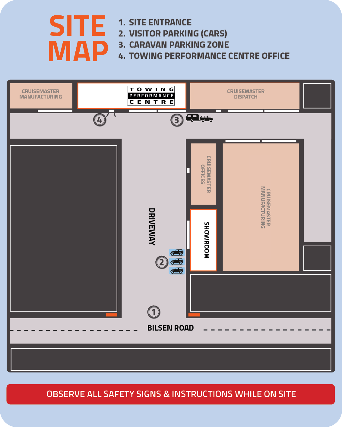 Thankyou for entrusting the Towing Performance Centre (TPC) to complete the service work, upgrades or modifications to your vehicle and/or caravan. Upon arrival at the Towing Performance Centre (refer to #1) with your car and/or caravan, we ask that you follow this parking plan to assist with ensuring the safety of our employees who may be working in this area and any other customers or visitors who may be present.